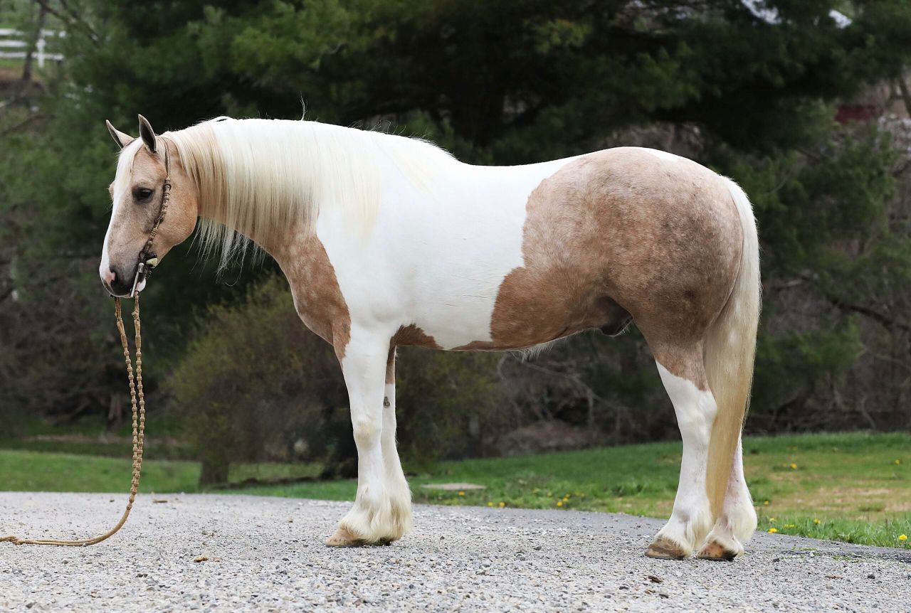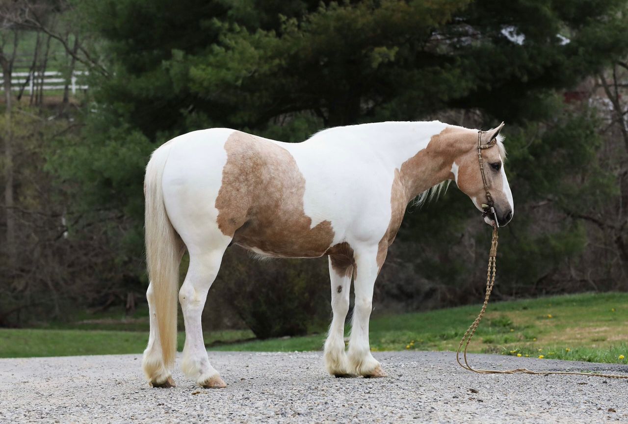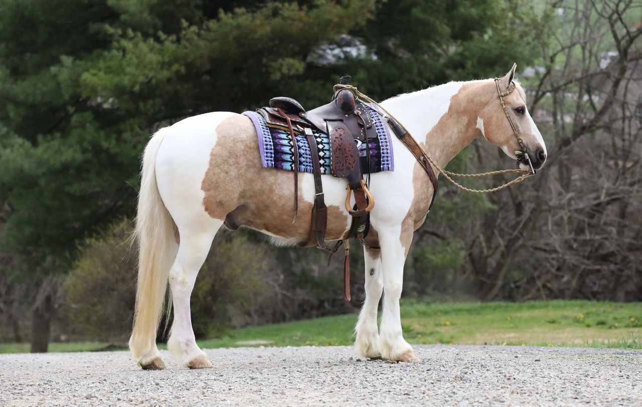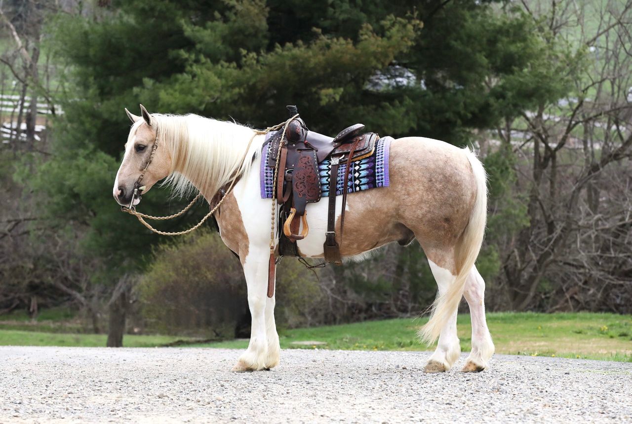 Troy is the definition of special. This gorgeous 2018 model Gypsy cross gelding stands at a solid 15 hands and sports a striking palomino and white coat that creates attention wherever he goes. His unique coloring and long flowing mane give him a perfect picture look, but it is his kind heart, soft eye, and steady mind that makes him truly unforgettable. Troy has been on countless trail rides across all kinds of terrain—through creeks, woods, open fields, and even along busy state roads and he loves every bit of it. He is traffic safe, unbothered by loud or sudden noises, and takes everything in stride. He has three incredibly smooth gaits: a calm, collected walk, a floaty jog you can ride all day, and a beautiful uphill lope that feels like riding a cloud. He picks up both leads easily, has a nice stop, and moves willingly off your leg. He is soft in the bridle but can also be ridden bridle less with ease, and he responds to a light one-hand neck rein. Troy will side-pass right up to your mounting block without needing to be asked twice and stands patiently while you get on. He has been ridden Western, English, and bareback and is happy to carry any level of rider with confidence and care. He is as honest as they come whether you ride him every day or leave him for a week, he steps out the same each time, with a willing attitude and calm demeanor. He is desensitized to tarps, jugs, whips, gunfire, and all the little things that might make a lesser horse nervous. Troy is the kind of horse who wants to be your partner and friend—he is always the first to meet you at the gate, loves attention, and has excellent manners in the barn. He stands great in the wash bay, is respectful for the farrier, and loads and unloads from the trailer without hesitation. Troy wears shoes on all four feet due to the rocky terrain where we ride, but he has strong, healthy hooves and could easily transition to barefoot if needed. He is up to date on all vaccinations, deworming, and dental work, and he is sound and healthy in every way. Horses like Troy do not come around often, he is safe, sane, and truly one of a kind. Whether you are looking for a dependable trail horse, a fun arena partner, or a steady mount for any member of the family, Troy is the kind of horse who will give you his whole heart and then some.